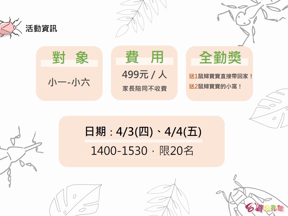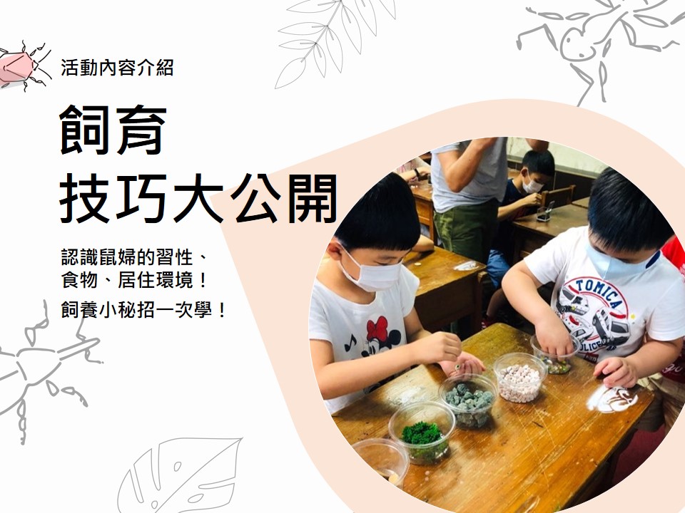 home 首頁 navigate_next 當季活動 navigate_next 台北-昆蟲動物主題系列課 navigate_next 小小動物飼育員-飼育半日營