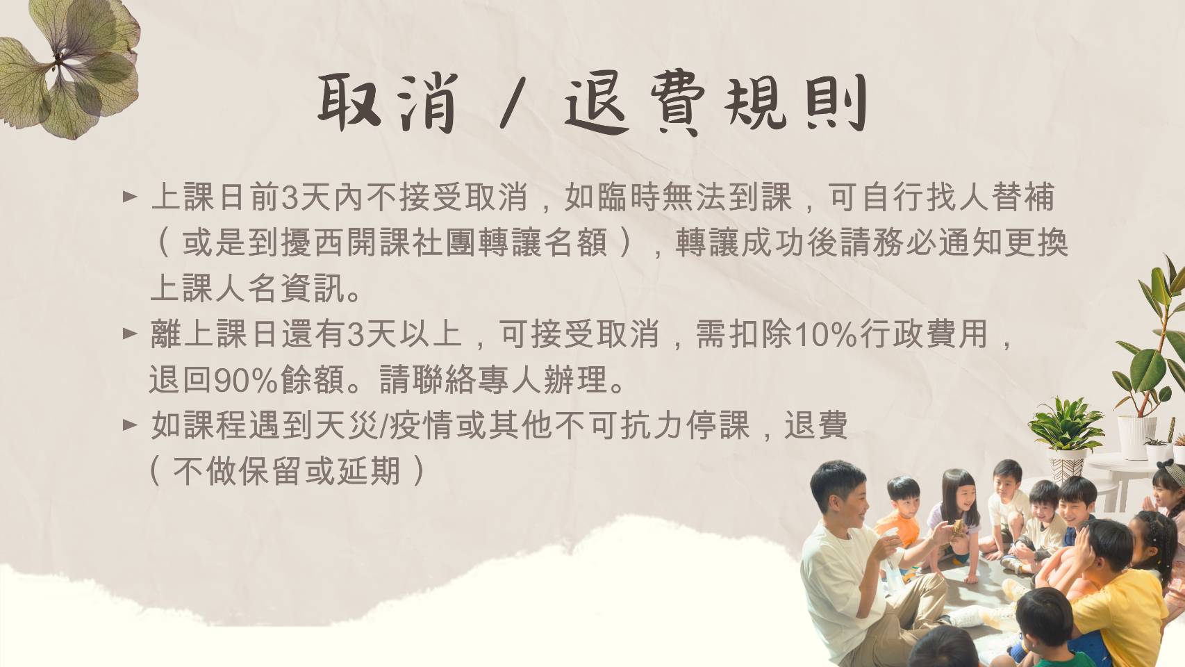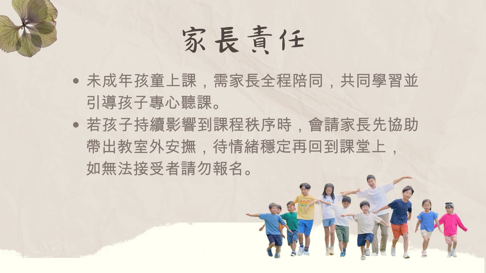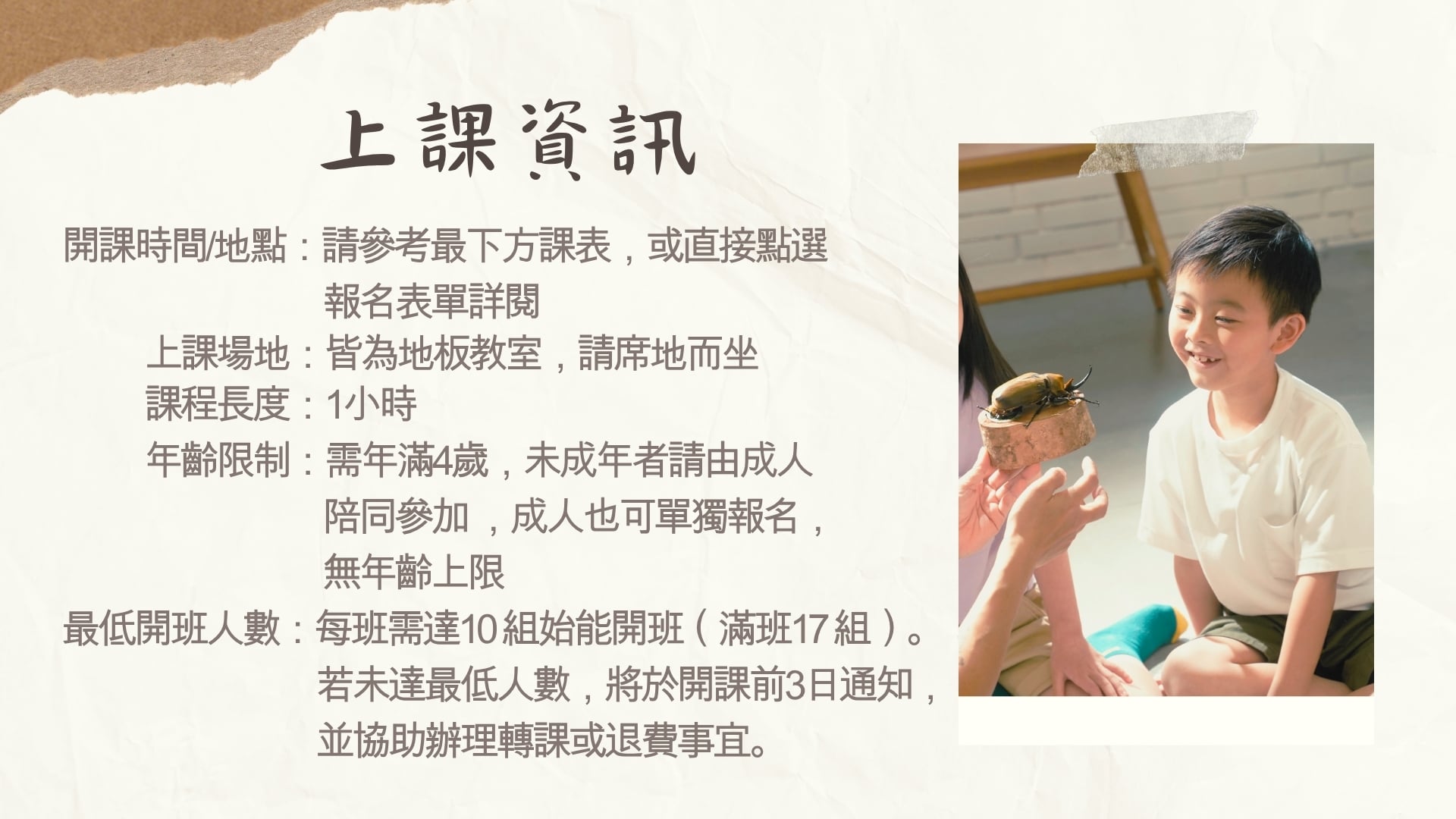 *單堂課最低開班人數為 10 組,若未達開班人數,將於 開課前 3 天 主動通知,並協助轉課處理。