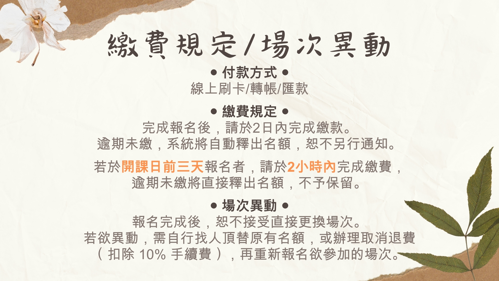 *請於報名後 2日內 完成繳費,以確保您的上課名額。