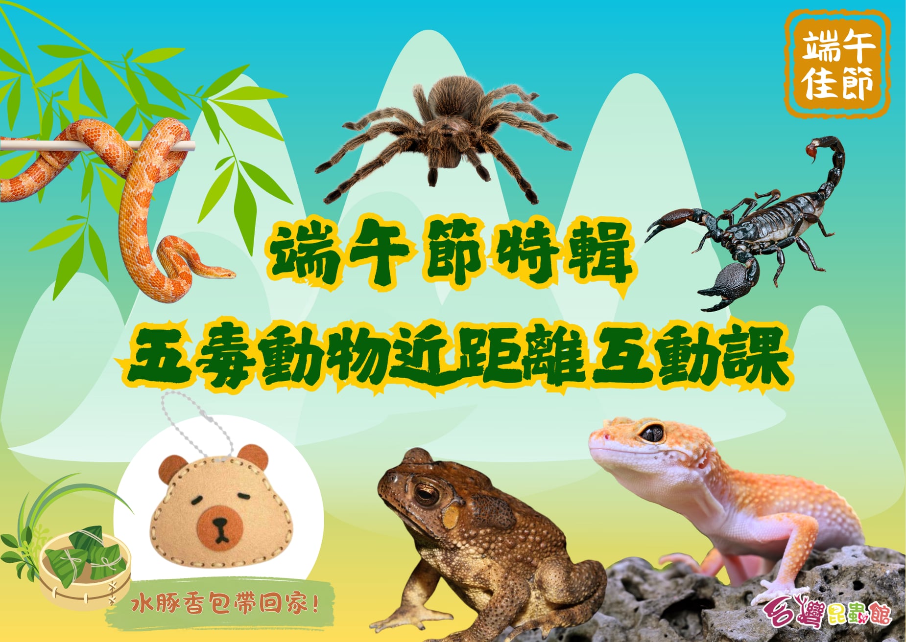 不論是近距離認識五毒動物、體驗水豚香包DIY,還是蛇蛇互動課和蛇蛻壓畫DIY,這裡都能滿足你!